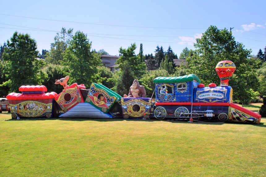 Our Circus Train Bounce House is the perfect way to entertain the kids for hours. So, you know you can’t go wrong with the Train Bounce House. Who doesn’t love the Circus? The course and slide are inflated while the floor is not. The Circus Train is perfect for any School Event or backyard celebration. Add more Bouncy Fun with Bounce Houses, Bounce Slides, Inflatable Games, Obstacle Courses, Interactive Inflatables and More!